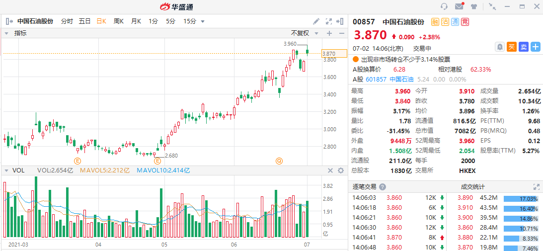 在净利润大增的预告利好之下,中国石油股份股价在7月2日早间一度涨近5%,随后股价有所回落,但上半年中国石油股份仍累涨超60%。