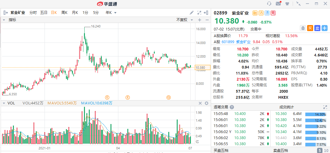 不过紫金矿业H股的股价自从2月创下历史新高的16.2港元之后就呈现下跌状态,一直跌到7月2日盘中的10港元水平。