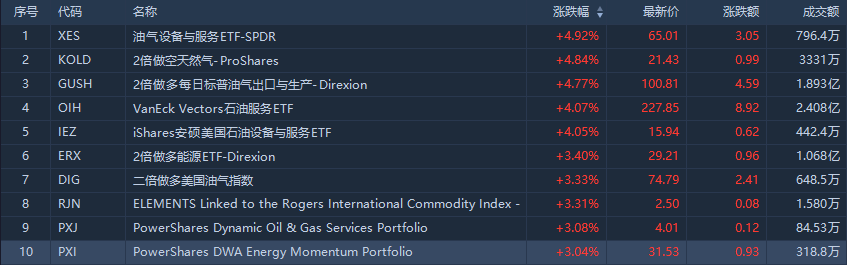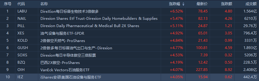 ETF涨幅榜方面,涨幅居首位的是Direxion每日标普生物技术3倍做多ETF(LABU),收涨6.52%,成交额达1.564亿美元;每日三倍做多营建股ETF(NAIL)涨5.47%,成交额6210万美元。