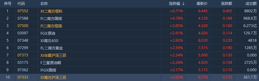 受消息影响,今日涨幅位居前的ETF有南方两倍做空恒科(07552.HK),收涨6.71%,成交额达8802万港元;南方两倍看空恒科(07500.HK)涨3.85%,成交额6.273亿港元。