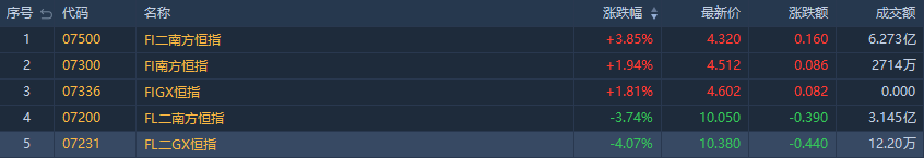受消息影响,今日港股涨幅居前的ETF有南方两倍看空恒指(07500.HK),收涨3.85%,成交额6.273亿港元;