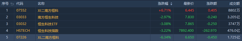 看多恒指相关ETF走弱,南方两倍做多恒科(07226.HK)跌6.34%,成交额约1.725亿港元;南方恒生科技(03033.HK)跌2.97%,成交额约3.205亿港元;