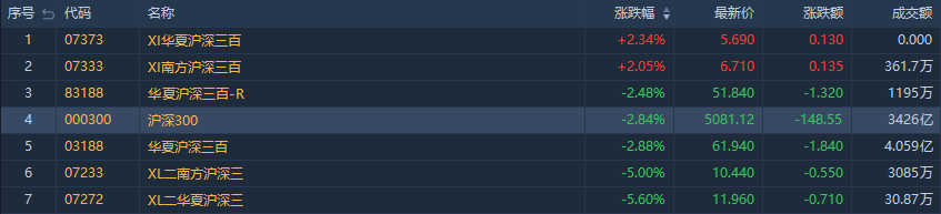 沪深300指数收跌2.84%。其中,华夏沪深三百-R(83188.HK)跌2.48%,成交额达1195万港元;华夏沪深三百ETF(03188.HK)跌2.88%,成交额约4.059亿港元。