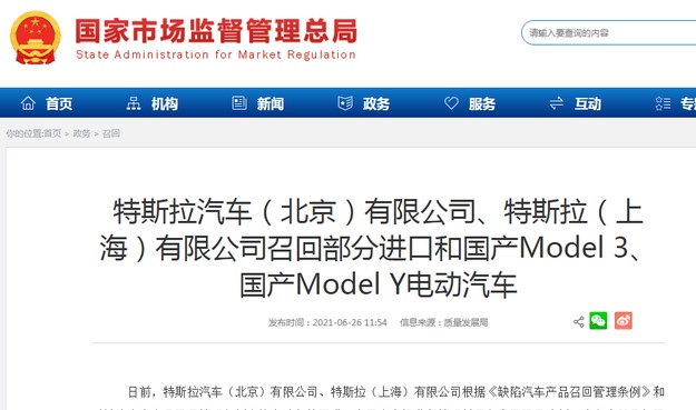 6月26日,国家监管总局发布公告称,特斯拉因存在安全隐患问题而在线召回超过28万辆汽车。