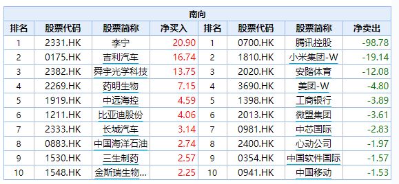 个股资金流向统计:南下资金扫货李宁、吉利,沽出腾讯、小米