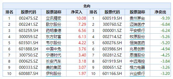 本周北上资金买入金额最多的标的为立讯精密,一周净买入10.08亿元。歌尔股份获净买入7.29亿元,药明康德获净买入6.56亿元。东方财富、韦尔股份、中国中免也获港资加仓。