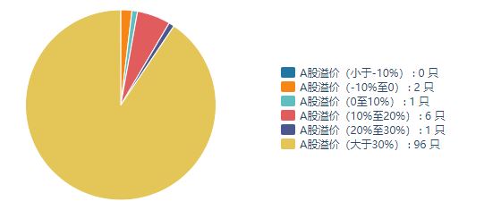 本周有96只A股溢价超过30%,1只溢价在20%至30%之间,6只在10%至20%之间,有1只溢价在10%之内。