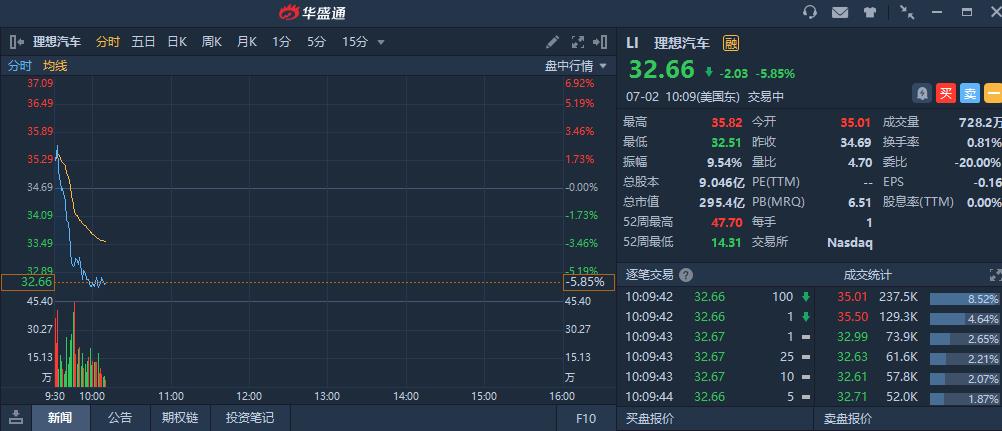 华盛资讯7月2日讯,中概股造车新势力高开低走,理想汽车(LI.O)跌5.85%,小鹏汽车(XPEV.N)跌超4%,蔚来汽车(NIO.N)跌3.50%。