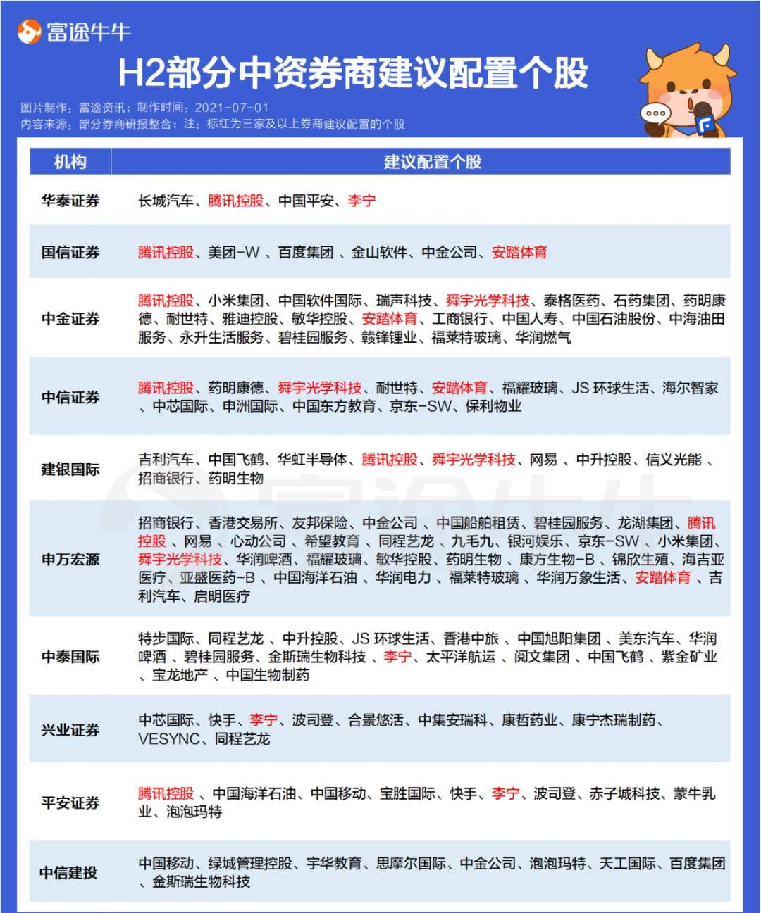 再看一下,中资券商给的下半年港股配置指引,腾讯的低估,以及国朝概念的李宁、安踏,还有苹果产业链的舜宇等等。