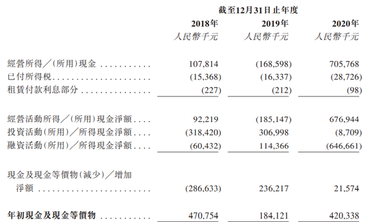 值得注意的是融资活动所得现金净额,除了2019年为正1.14亿元,2018、2020年均为负值,其中2020年负值进一步扩大,达到6.47亿元。