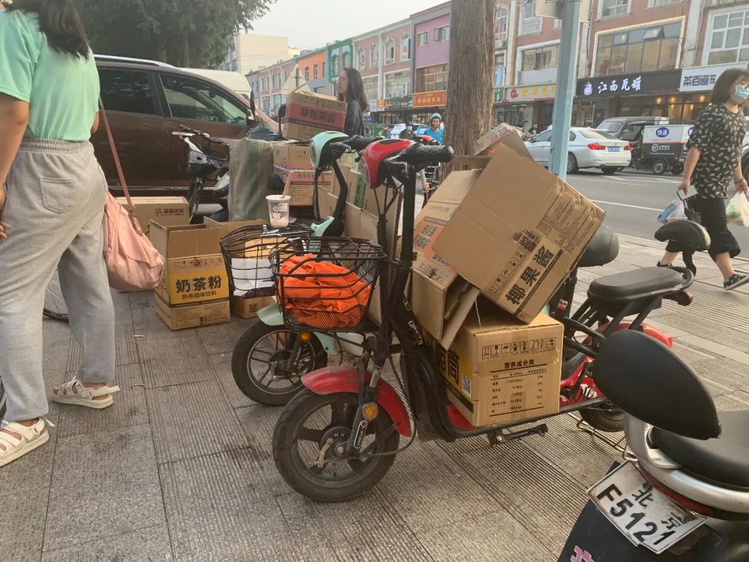 某奶茶连锁店外的奶茶粉等原料