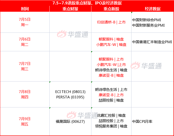 经济数据方面,下周一中国财新综合PMI、服务业PMI周一公布,中国6月CPI数据周五公布。