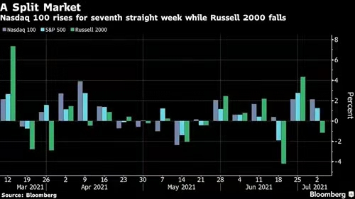 周五(7月2日),标准普尔500指数连续六周上涨,收于4300点上方,为历史首次。以科技股为主的纳斯达克100指数表现突出,实现了连续七周上涨,这是自2019年11月以来最长的连续上涨。对经济敏感的股票表现落后,规模较小的罗素2000指数下跌。
