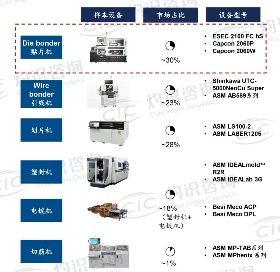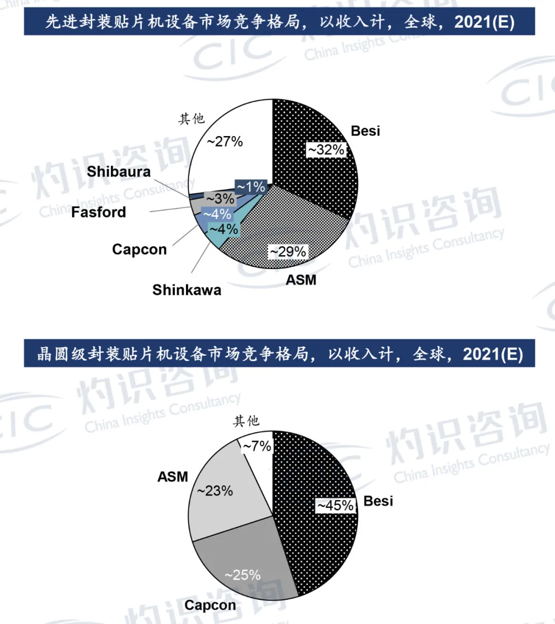 据CIC灼识咨询统计,目前先进封装贴片设备,以出货量或收入计,市场中Besi、Capcon和ASM几乎占据市场绝大多数体量。