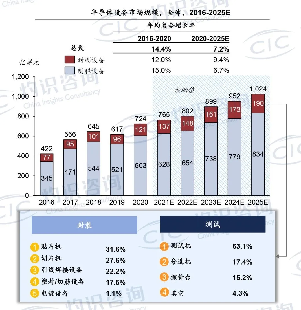 根据CIC灼识咨询统计数据,2020年,全球半导体设备市场达到724亿美元,预计到2025年将达到1,024亿美元,复合年增长率为7.2%。CIC灼识咨询预测,全球封测设备在半导体设备中的占比将从2020年的16.7%提升到2025年的18.6%,市场体量将达到约190亿美金。