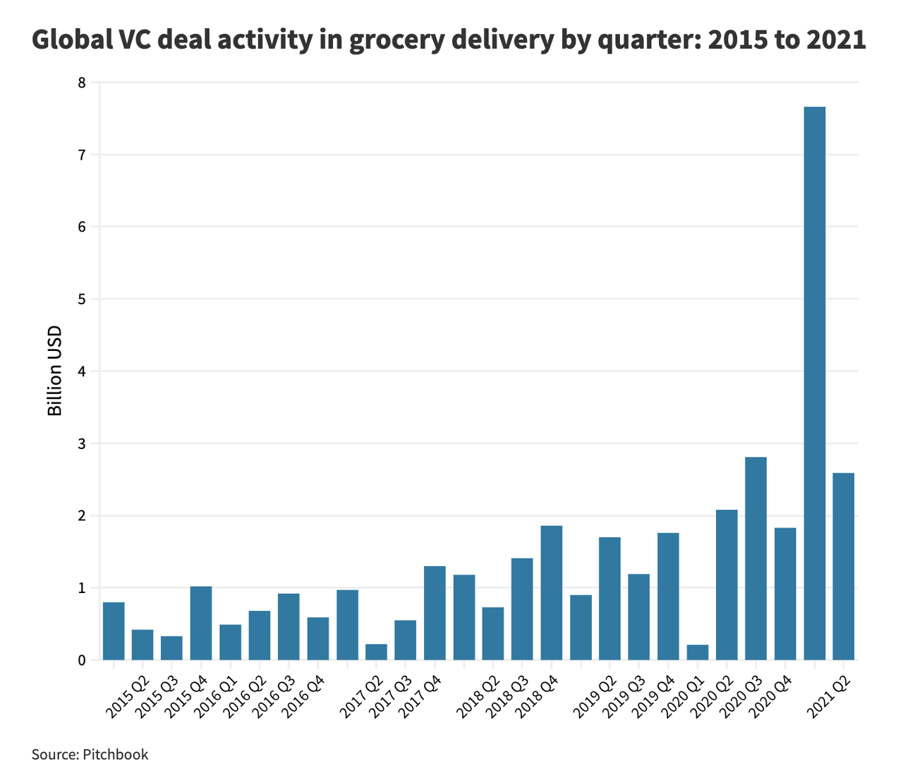 PitchBook 数据显示,2020年全年,生鲜电商初创公司所获投资资金共计70亿美元。2021年投资的速度还在加快,截止 Q2,投资总额已达100亿美元。
