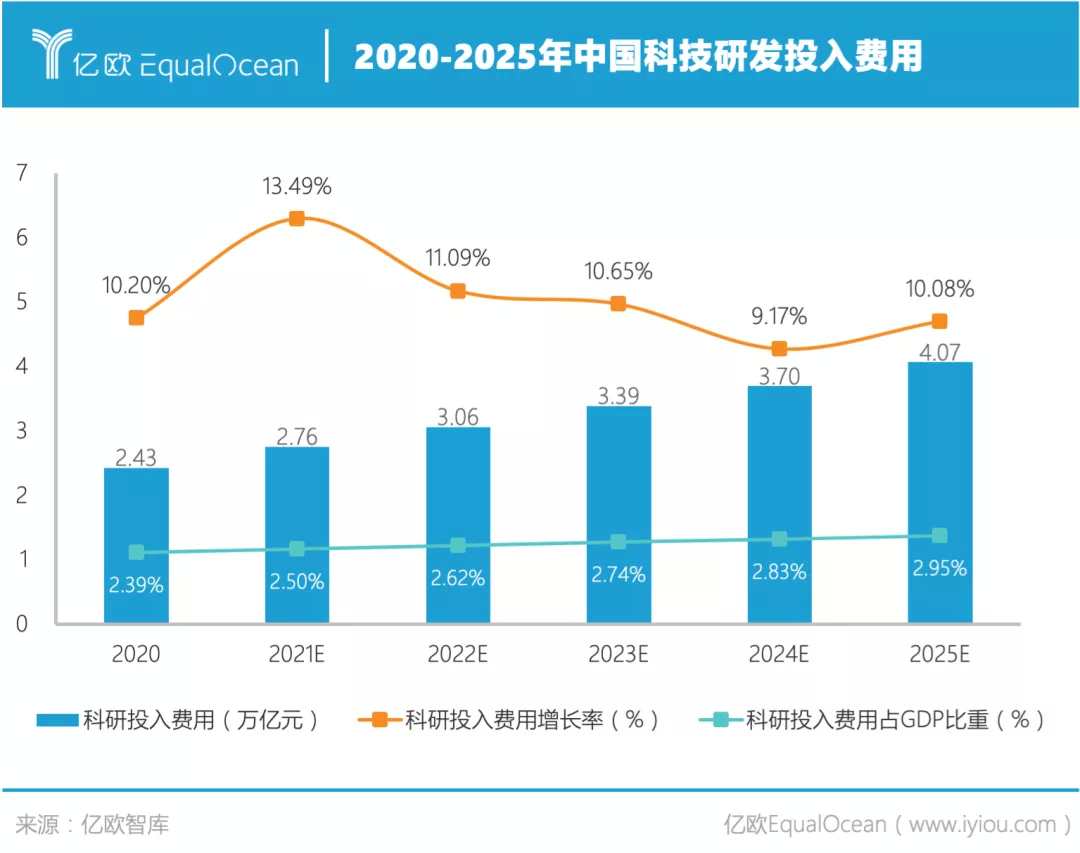 亿欧智库预计,中国科研投入仍将保持年平均两位数高速增长态势。预计2022年中国科研投入费用突破3万亿元,2025年超过4万亿元,GDP比重将提升到近3%,届时将有机会涌现更多大型科技公司。