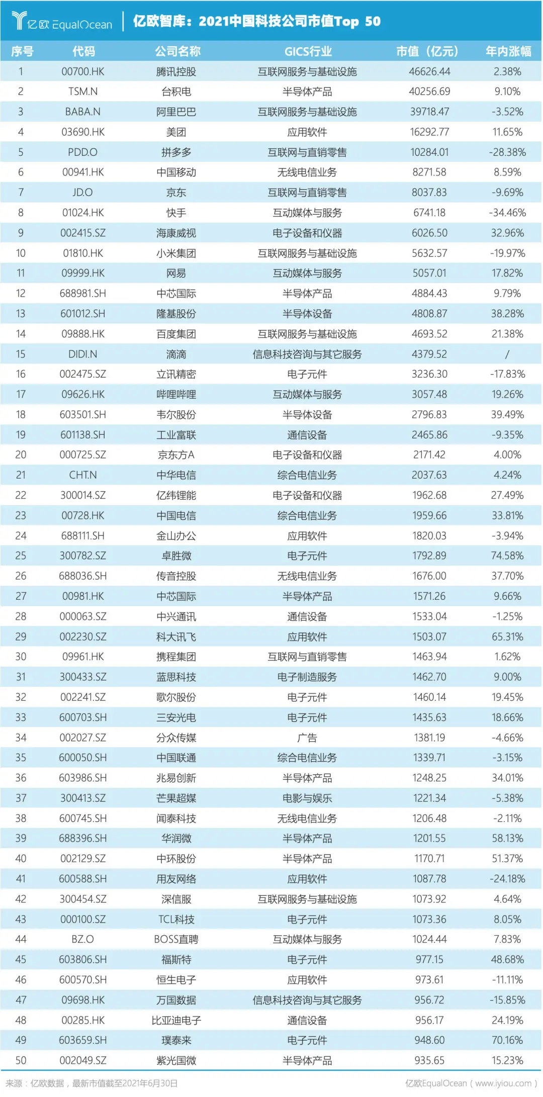 值得注意的是,快手(01024)是Top 50中唯一在今年上市的科技公司,但其市值已相对于IPO跌去34.46%,中国公司未来成长空间巨大。