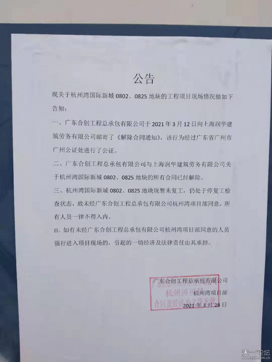 此外,合创工程还在公告中表示,其于3月12日向上海润华建筑劳务有限公司邮寄了《解除合同通知》,与润华建筑关于杭州湾国际新城0802、0825地块的所有合同已经解除。