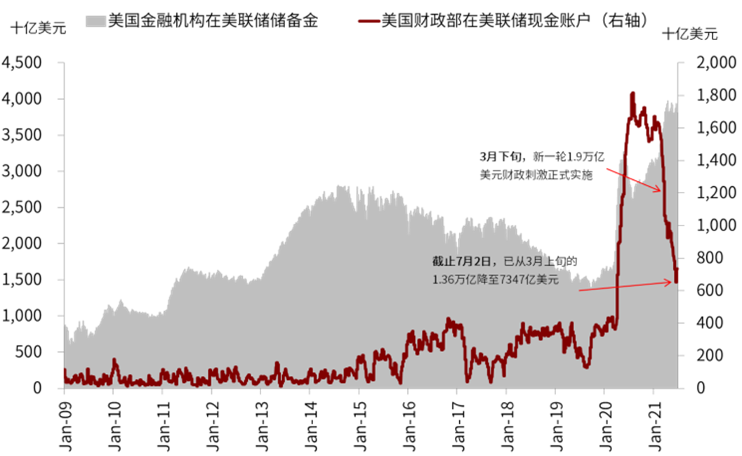 如我们在《近期美元流动性激增的内外部含义》中所述,5月以来美联储逆回购操作持续攀升的直接源头是3月下旬新一轮1.9万亿美元财政刺激相关的补贴发放(美国财政部的现金账户TGA账户从3月末的1.03万亿美元已回落至当前的7346亿美元),这一补贴形成了居民的超额储蓄(3月美国居民储蓄率一度高达27.6%,目前仍有12.4%,超额储蓄近2.4万亿美元,相当于GDP的~10%),又进一步转化成金融系统的剩余流动性。