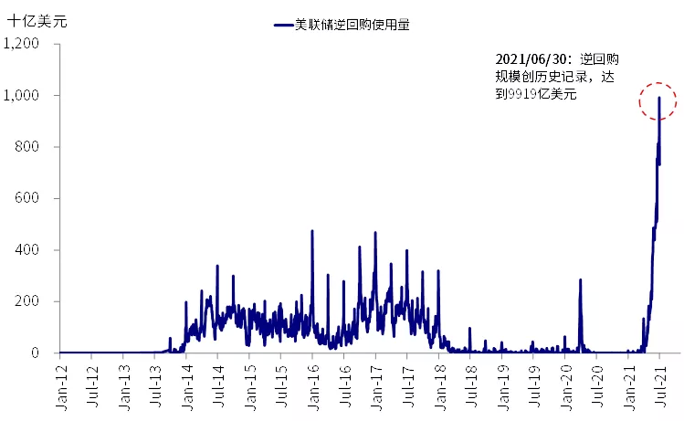 美联储近期逆回购使用规模再创新高,6月月30日当日逆回购规模近1万亿美元