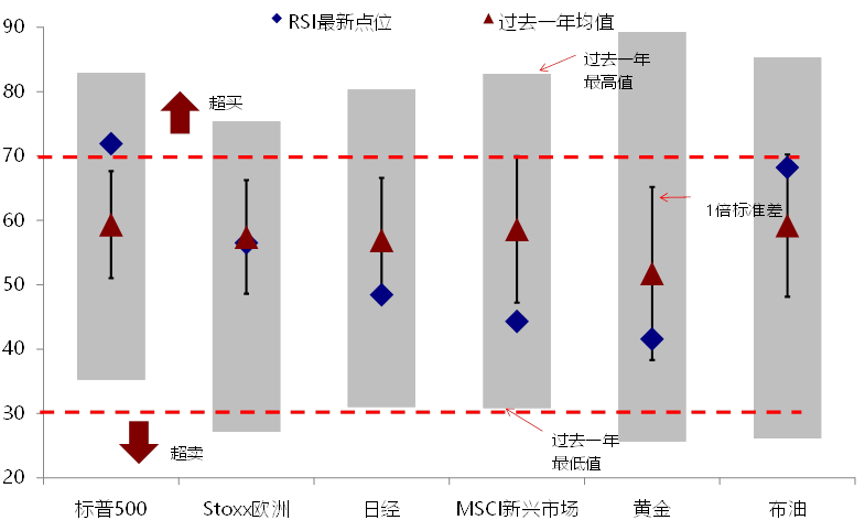 过去一周,美股RSI点位抬升,已超买,欧洲。日本、新兴股市RSI点位回落;油价超买缓解