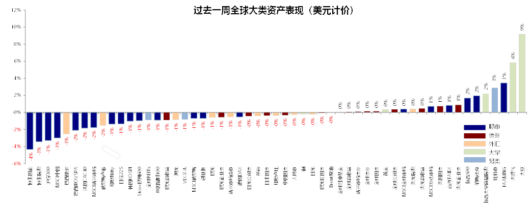 过去一周,美元计价下,大宗>股>债,大豆、天然气、FAAMNG、比特币、美股领涨;A/H股、巴西里尔、巴西股市领跌
