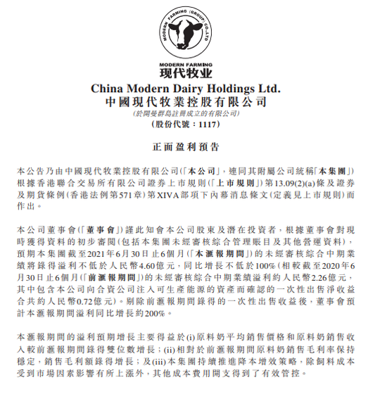 7月5日消息,现代牧业发布公告,预期集团截至2021年6月30日止6个月的未经审核综合中期业绩将取得溢利不低于人民币4.60亿元,同比增长不低于100%(相较截至2020年6月30日止6个月的未经审核综合中期业绩溢利约人民币2.26亿元,其中包含公司向合资公司注入可生产能源的资产而确认的一次性出售净收益合共约人民币0.72亿元)。剔除前汇报期间取得的一次性出售收益后,董事会预计本汇报期间溢利同比增长约200%。
