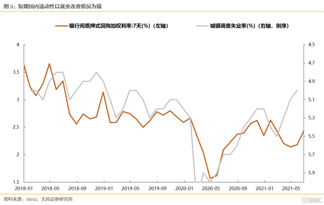 国内流动性:随着Q2就业率恢复,Q3流动性比Q2再超预期的可能性较低,为后面预留政策空间可能性更大;