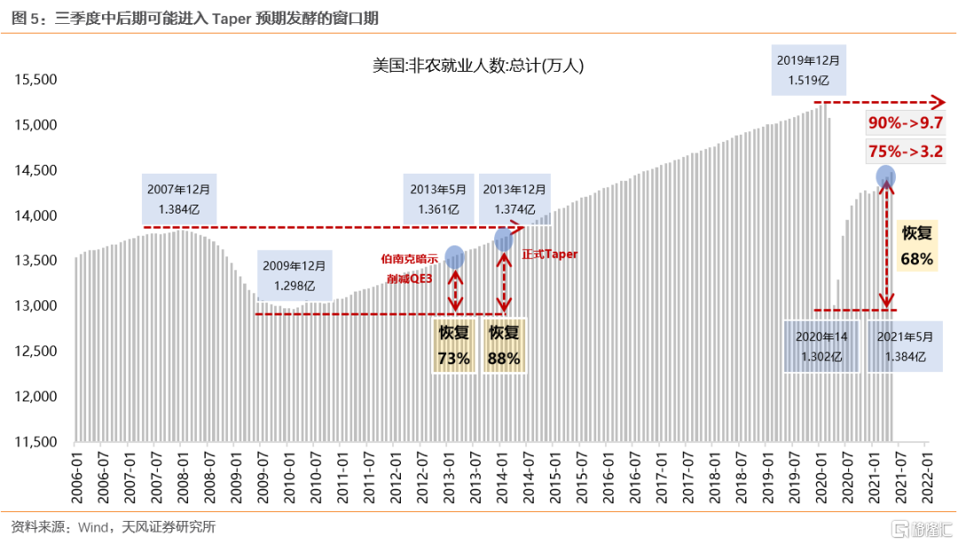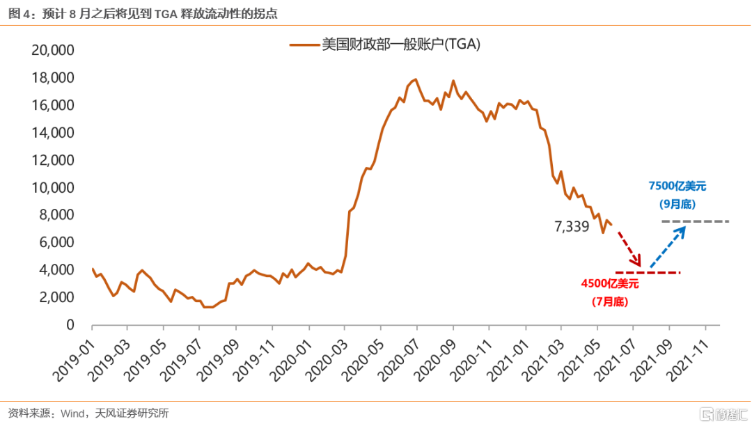 美元流动性:预计于Q3开始减弱,8月是观察窗口期,包括TGA释放流动性的拐点(银行间流动性减弱)、全球央行年会鲍威尔表态(Taper预期发酵)。