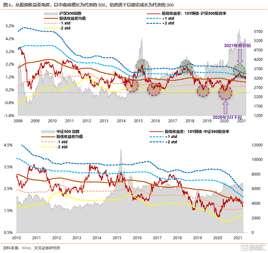 3、但是,如下图,股债收益差的角度,春季前沪深300触及2x方差,也是我们此前提出开辟超额收益新战场的一个重要依据,目前看,以中盘高增长为代表的500,仍然优于以稳定成长为代表的300。估值逻辑上,短期G(高景气)的权重继续大于久期T(稳定ROE)的权重。
