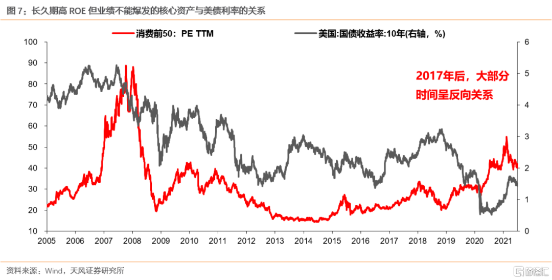 但是,随着去年Q4开始,全球经济逐步走出疫情,进入复苏的窗口期,美债利率震荡上行,资金的预期回报目标也随即开始提升,同时高ROE长久期资产的估值也高高在上,这种高估值溢价,可能还会被压缩。