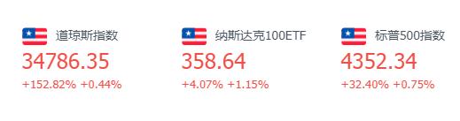 截至收盘,纳斯达克综合指数涨116.95点,涨幅0.81%,报14639.33点;道琼斯指数涨152.82点,涨幅0.44%,报34786.35点;标普500指数涨32.4点,涨幅0.75%,报4352.34点。标普500指数连续7日创历史新高,为1997年以来首次。