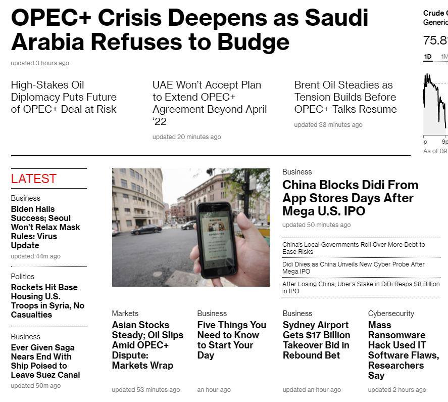 阿联酋表示,它拒绝其他欧佩克+成员国将欧佩克减产协议延长至2022年4月之后的计划,除非允许其为自己的减产设定更高的基准。阿联酋周五阻止了欧佩克+协议,该协议的卡特尔领导人俄罗斯和沙特阿拉伯为增加供应而商讨,要求为自己提供更好的条件。经过两天激烈的谈判,而阿联酋是唯一的坚持者,部长们将谈判暂停到周一,随着石油继续飙升至每桶75美元以上,市场陷入困境。