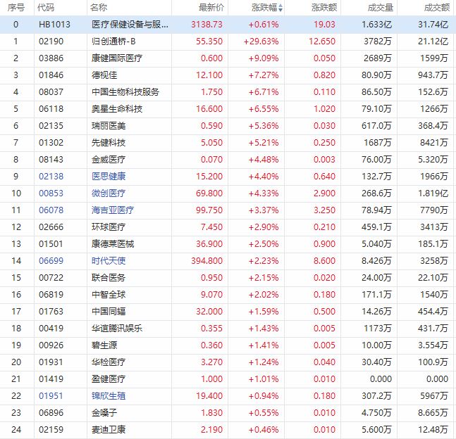 华盛资讯7月5日消息,医疗设备板块早盘拉升上涨,截止发稿,归创通桥-B上涨29.63%;康健国际医疗上涨9.09%;徳视佳上涨7.27%;中国生物科技服务、奥星生命科技涨超6%;瑞丽医美、先健科技涨超5%;金威医疗、医思健康、微创医疗涨超4%;海吉亚医疗上涨3.37%。
