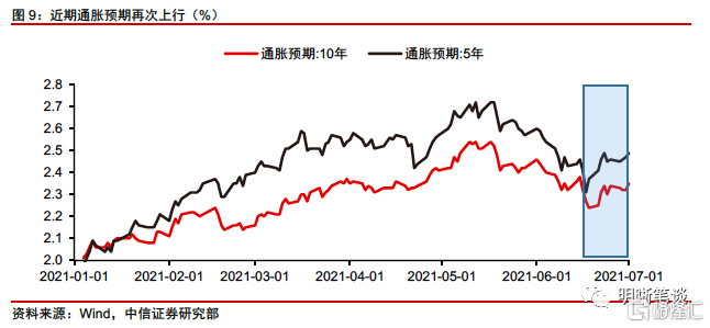 6月美联储议息会议鹰派超出市场预期,在点阵图、经济预测以及鲍威尔关于通胀讲话的三重作用下,通胀预期转而向下。首先,点阵图显示加息或将提前,成为本次会议最大鹰派信号。其次,经济预测大幅调高通胀前景,引发市场担忧美联储会对通胀采取行动。再次,鲍威尔对于通胀的讲话显示美联储对于通胀持续性的认识发生变化,暗示美联储可能会采取行动压制通胀。在以上三重作用下通胀预期转而向下。
