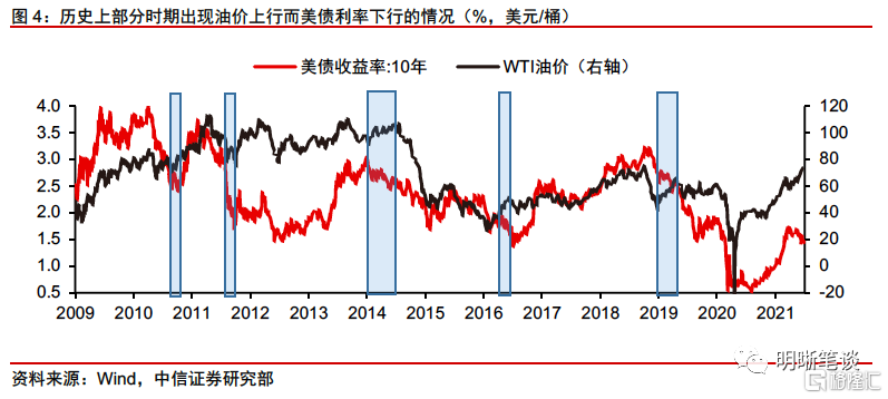 尽管在大多数时间里,油价与美债利率正相关,但是历史上仍有部分时期出现油价上行而美债利率下行的情况。从历史上看,在2010年10月左右、2011年11月左右、2014年年初、2016年上半年以及2019年年初均出现过油价上行而美债收益率下行的情况。以美债利率与当前水平最为接近的2011年11月左右为例,彼时美债收益率下行主要因为美联储于9月的议息会议上宣布开展扭曲操作(Operation Twist,OT)以压低长期利率,进而创造更为宽松的金融环境来促进经济复苏。与此同时,自2011年10月起,欧债危机企稳、伊核问题反复以及美国原油及成品油库存下降等因素导致原油供不应求,推动油价持续走高,导致在2011年11月左右出现了油价上行而美债利率下行的分歧。