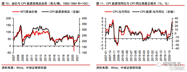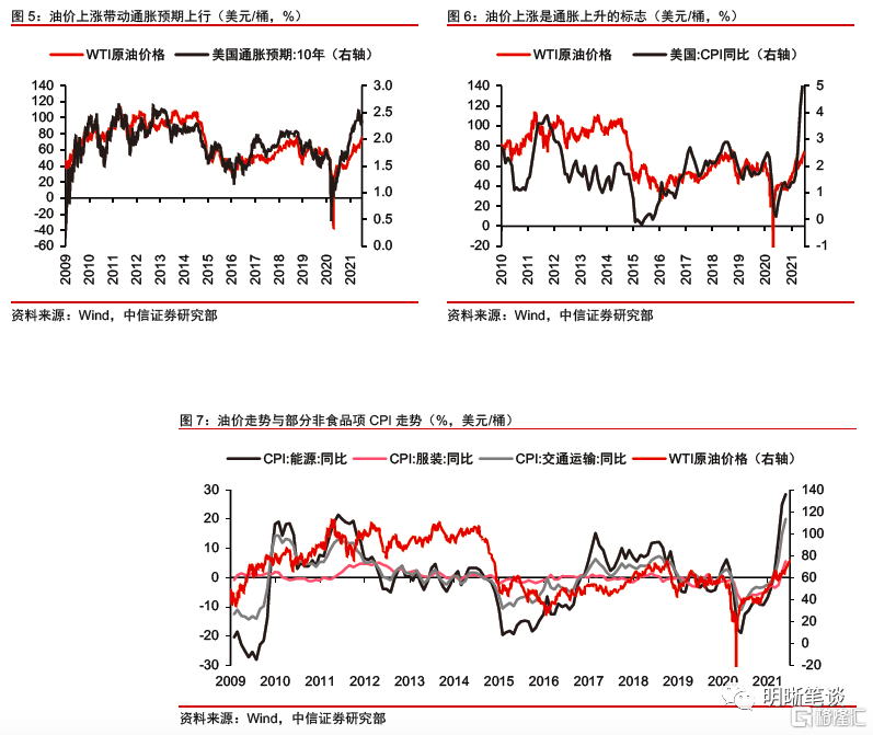从历史看,另一个重要问题是油价上涨是通胀上升的标志,特别是会带动通胀预期以及非食品项价格的上涨。从历史上几轮通胀上行周期来看,油价都是推升通胀的重要因素。例如,2011-2012年的通胀上行周期,美国CPI同比由1%左右上行至3.9%的单月高点,与此同时,WTI原油价格则从70美元/桶附近飙升至100美元/桶之上;而在当前这轮通胀上行周期中,WTI油价则是从30美元/桶附近上行至当前75美元/桶以上。另外,相比与整体CPI的正相关关系,油价与通胀预期的正相关关系更为明显,同时与非食品项的正相关关系也更为明显。