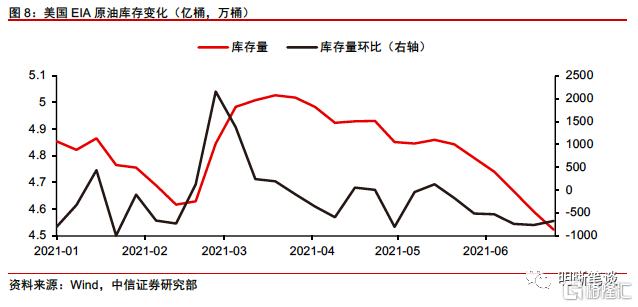 需求端来看,今年以来,美国EIA原油库存整体处于下行趋势,体现原油需求旺盛。5月起原油库存连续6周下降,反映当前供需缺口较大。6月30日,EIA最新数据显示,截至6月25日,当周原油库存减少671.8万桶,降幅高于预期的385万桶,为连续6周下降,连续下降的原油库存反映当前原油供需缺口较大。供需两端共同作用推升原油价格走高。