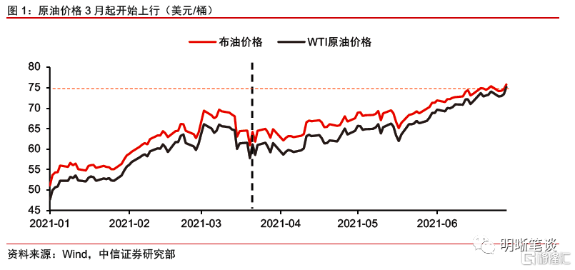 近期油价飙升主要得益于疫情后的经济复苏带动原油需求走强,同时于去年4月生效的OPEC+减产协议仍在持续,原油供需缺口扩大。供给端来看,尽管OPEC+在原先减产协议的基础上有所松动,但是原油供需缺口仍存,原油价格一路飙升。根据Bloomberg消息,本周四,OPEC+早先初步达成协议,2021年12月前平均每月增产40万桶/日,但在之后两天的会议上,因阿联酋坚决反对而搁置。OPEC+计划在会议上投票决定从2021年8月至12月增产约200万桶/日,并将剩余即将到2022年4月到期的减产延长至2022年底,但是阿联酋同意增产,却拒绝支持延长减产协议,导致谈判暂且搁置。在OPCE+会议之后,WTI和布油价格双双站上75美元/桶,其中WTI油价创2018年10月以来的新高。