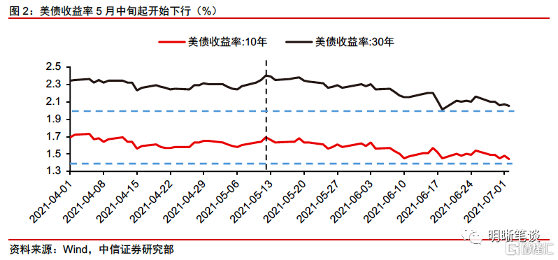 本轮美债利率的下行分为两个阶段,美联储6月议息会议之前是流动性过剩和拜登基建计划受阻推动的下行,议息会议之后是流动性过剩下通胀预期下行引发的利率下行,而最近一周通胀预期有所上行,实际利率又有所下行。同时,交易平仓也是美债利率走低的一个重要驱动因素。