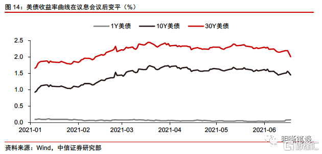 此外,美债收益率曲线变平,前期押注“再通胀”做陡曲线的交易平仓也导致美债利率走低。美国4、5月份的CPI大幅超预期引发市场大规模的“再通胀交易”,不少债券市场投资者选择做陡收益率曲线。然而美联储的议息会议打击了曲线变陡的预期,市场意识到他们可能高估了平均通胀目标制的作用和美联储对通胀的容忍度。在这种情况下,做陡曲线的仓位开始平仓,导致长端债券的购入压力增加,曲线持续走平:10Y-1Y美债利差由议息会议前的143bps下降到136bps;30Y-10Y美债利差由议息会议前的69bps下降到56bps。