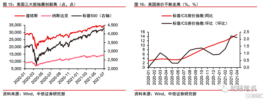 最后,我们认为当前油价与美债利率分歧过大,利率定价过低,可能导致美国资产定价过高,美国资本市场可能蕴含一定的金融风险。从历史回顾来看,在油价到达75美元/桶的同等情况下,当前美债利率水平是历史上的绝对低位,油价与美债利率的过大分歧暗示当前美债利率可能存在错误定价,即利率水平被定价过低。与之相对应地,可能是当前美国资产的定价被高估,美股三大指数近来屡创新高,同时美国房地产市场也十分火热,房价不断走高。在这种情况下,美国资本市场很可能蕴含一定的金融风险,如果利率定价回到正轨,需警惕美国资本市场风险暴露。