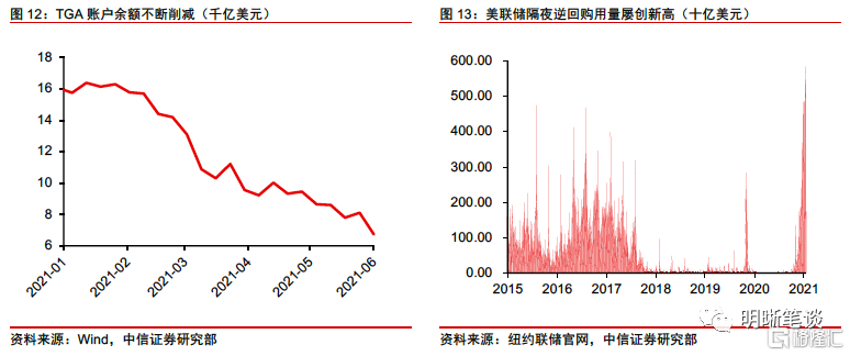 金融体系流动性过剩是6月议息会议前美债利率下行的核心逻辑,同时也是直接原因。一方面美联储继续维持每月持续购债的量化宽松政策,另一方面,美国财政部持续削减其TGA账户余额,自2月财政部宣布削减TGA账户余额以来,TGA账户余额不断下降,大量流动性被投放到金融体系。在美联储和财政部的共同刺激下,美国金融体系流动性过剩,这从近期屡创新高的隔夜逆回购用量上也可以看出。