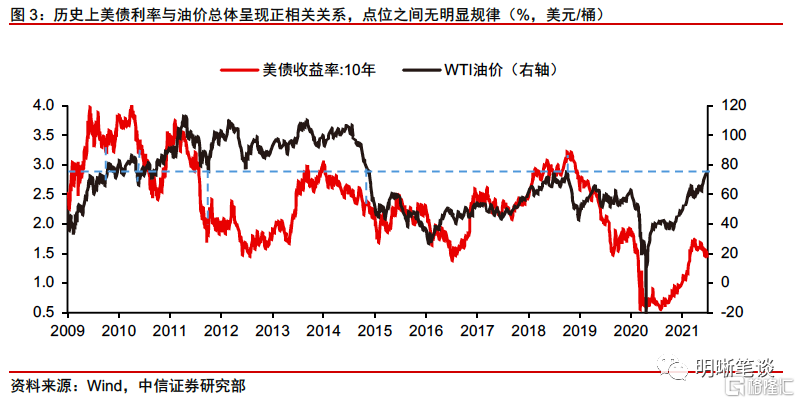 从2008年金融危机之后的油价和美债利率走势来看,二者总体上呈现正相关关系,但油价点位和美债利率点位之间的关系没有明显规律,在油价位于75美元/桶时,当前美债收益率水平处于历史绝对低位。2009年以来,10年期美债收益率与WTI油价总体上呈现正相关关系,简单计算二者自2009年以来的相关系数为0.4043。从历史上看,当油价上升到75美元/桶左右的水平时,美债利率所处的点位介于1.8%-4%之间。当前油价再次站上75美元/桶,但美债收益率仍在1.5%以下的水平震荡,当前美债收益率的水平处于油价在75美元/桶时的历史绝对低位。
