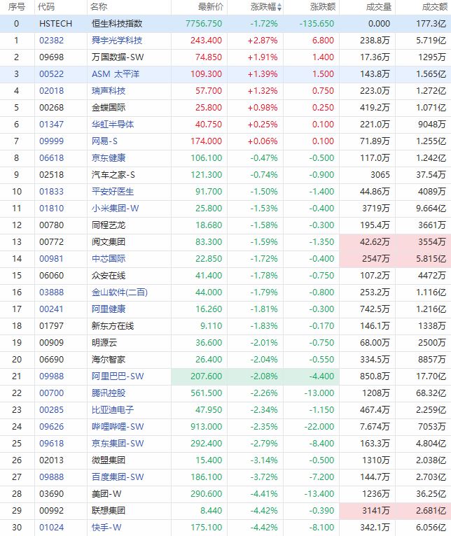 快手-W、联想集团、美团-W跌超4%;百度集团-SW、微盟集团跌超3%;京东集团-SW、哔哩哔哩-SW、比亚迪电子、腾讯控股、阿里巴巴-SW等跌超2%。