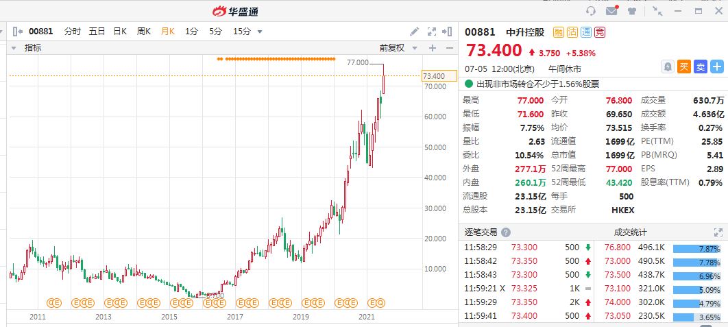 今日早盘,中升控股大幅高开逾10%,最高见77港元每股,刷新历史新高,较年初累涨逾40%。截至午盘,中升控股依然有5%的涨幅,总市值达1699亿港元。