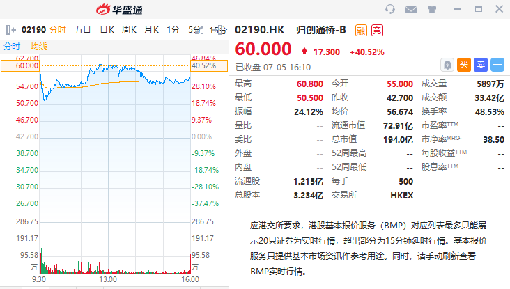 华盛资讯7月5日讯,医疗器械公司归创通桥-B(02190.HK)首挂收报60.00港币,较发行价42.70港币暴涨40.52%,一手浮盈8650港币,全日成交额33.42亿港元,最新总市值达194亿港元。