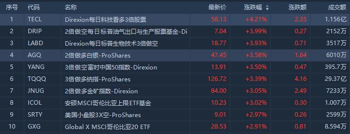 从ETF涨幅榜来看,做多科技ETF涨幅居前,每日科技看多3倍股票涨4.21%,成交额1.16亿美元;3倍做多纳指涨3.39%,成交额29.37亿美元;美股小盘股3X空涨2.97%,成交额2599万美元。