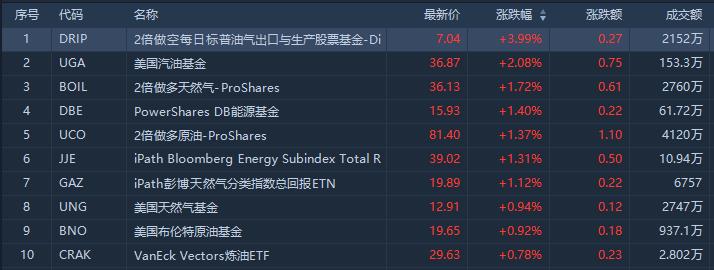 从ETF涨幅榜来看,2倍做空每日标普油气出口与生产股票ETF涨近4%,成交额2152万美元;2倍做多天然气ETF涨1.72%,成交额2760万美元。